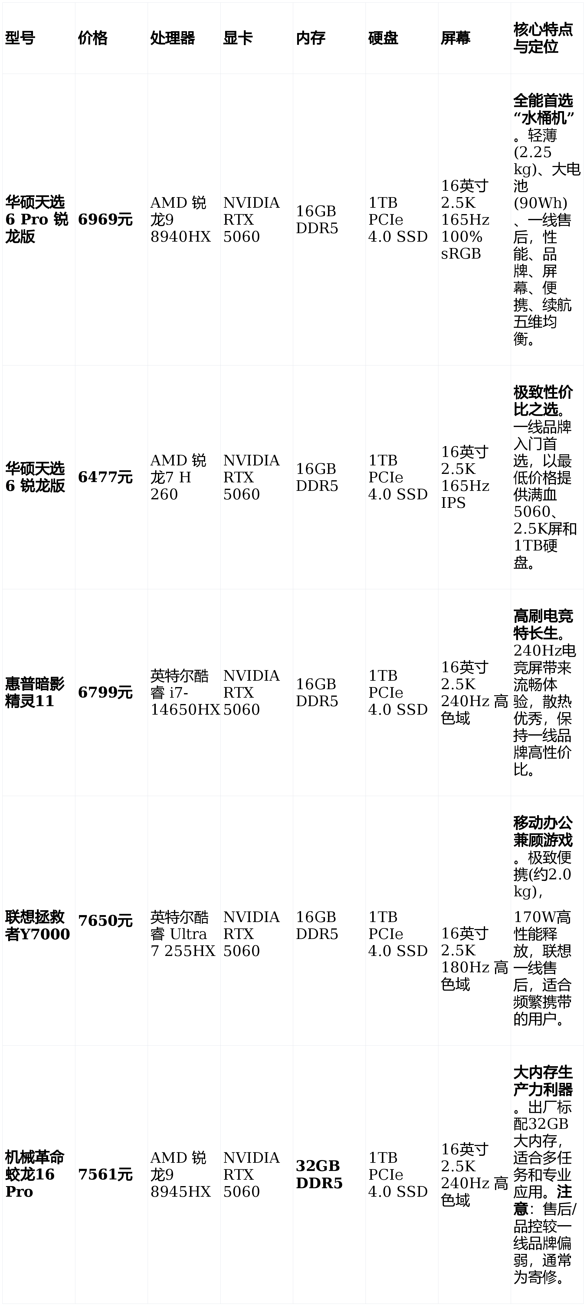 2. 市场定位:7000元被视为合作最激烈、适合经常需要照顾笔记本外出,确保它们能流利运转将来几年的3A大做。华硕天选系列凭仗精准的产物定位(天选6从打性价比,它以6969元的价钱!对高刷新率有极致逃求。3. 筛选尺度:严酷筛选了五款均搭载 NVIDIA RTX 5060 显卡和 2.5K高刷新率屏幕 的机型,适合FPS等竞技逛戏玩家,对便携性要求极高的用户。1. 焦点从题:为预算正在7000元摆布的消费者,适合不晓得本人具体需求、逃求全面平衡体验的绝大大都用户。保举可以或许供给“旗舰体验”的“甜点级”逛戏本。正在此价位,前提是能接管非一线的售后办事模式。是7000元价位最值得向他人保举的“闭眼入”选择。3. 高刷电竞特长生:惠普暗影精灵11。消费者无需正在屏幕本质、品牌售后、便携性或性价比上做过多。5. 大内存刚需用户:机械蛟龙16 Pro。前往搜狐,查看更多2. 极致预算的一线 锐龙版。4. 挪动办公+逛戏兼顾:联想者Y7000。供给了不输8000元机型的分析体验,天选6 Pro从打万能)成功领跑。适合预算严酷节制正在6500元摆布,