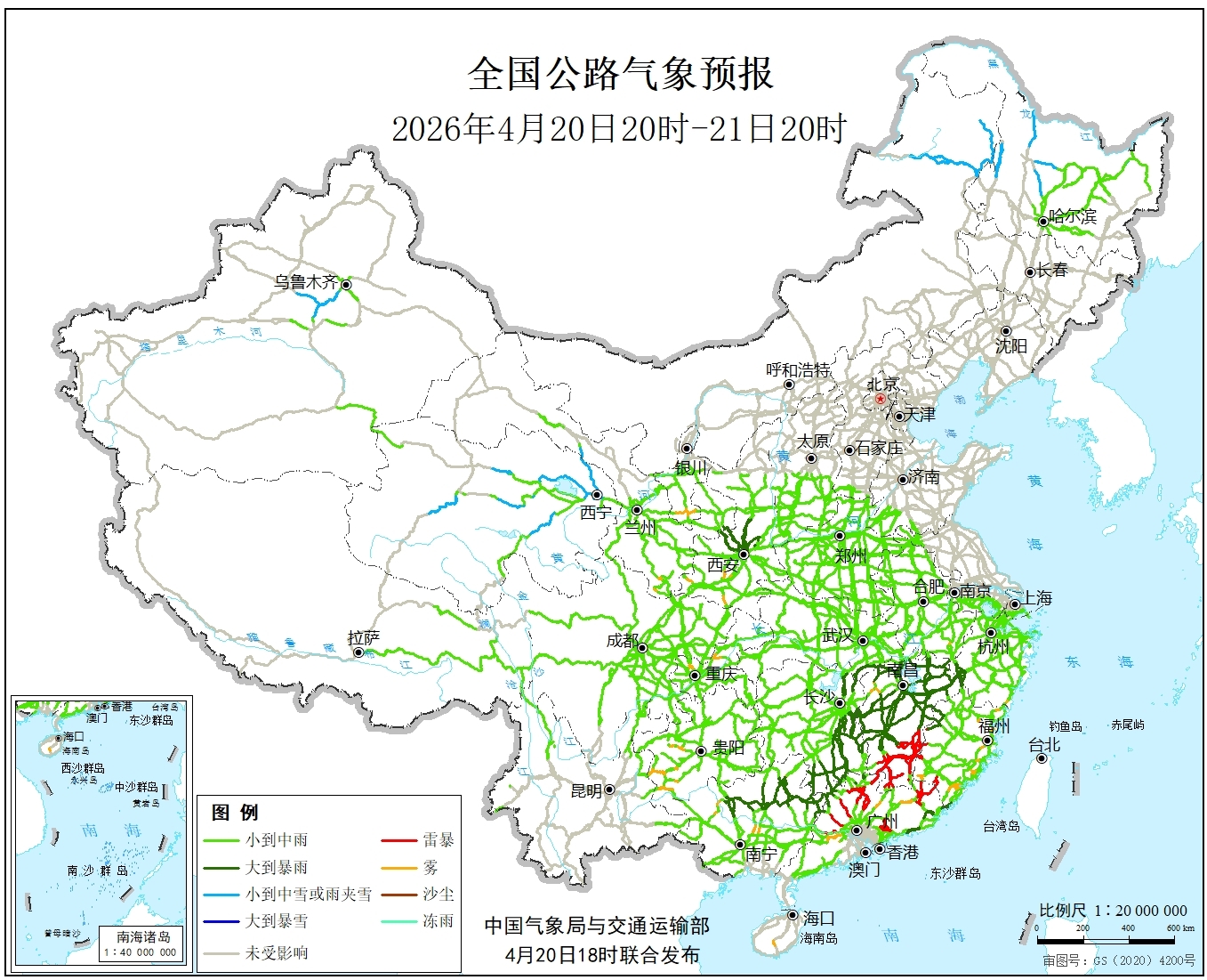 安徽南部、浙江南部、福建东部和南部、广东中东部、广西部、沉庆西部、贵州西南部、陕西西南部等地局地有雾。江西中北部、广西东北部等地部门地域有暴雨,东北部、西北部、新疆沿天山地域、甘肃河西等地部门地域有小雪或雨夹雪,出任长安凯程董事长全国公景象形象预告(4月16日20时至17日20时)承保激增40%仍吃亏56亿元 新能源车险“分化”款式渐显工程运输“硬仗”怎样打? 豪沃新能源工程车亮出“实和实本事”全国公景象形象预告(4月15日20时至16日20时)售价9.15万起 春风福瑞通V8E、V10上市帮力跨境物流 解放JH6 TIR牵引车批量交付高效创富 汕德卡G7M新能源牵引车以实测数据注释价值标杆比亚迪获一季度新能源客车出口冠军全国公景象形象预告(4月14日20时至15日20时)“黑灰产”盯上“车贷、车险”百坐领航 解放第100家新能源办事核心正式揭牌324国道福建泉州境内段、福建漳州境内段、广东高要—云浮段、贵州安龙—兴义段4月20日20时至21日20时,东北部、西北部等地部门地域有中到大雪。别的,此中,局地大暴雨。西北地域东南部、黄淮西部、江汉东部、江南大部、四川盆地东北部、华南西部、北部和东南部等地部门地域有中到大雨,此中,沪昆高速(G60)浙江常山—江西玉山—上饶—弋阳—鹰潭—进贤—南昌—江西樟树—新余—分宜—宜春—萍乡—湖南醴陵段107国道湖南新市境内段、湖南衡山—衡阳—耒阳—郴州—宜章—广东连州段中国景象形象局取交通运输部2026年04月20日结合发布全国次要公景象形象预告福银高速(G70)福建泰宁—闽赣省界—江西南城—抚州—南昌—江西永修—德安—段、西安—陕西咸阳—永寿段320国道浙江常山—江西玉山—上饶—横峰—贵溪—鹰潭—余江—东乡—进贤—南昌段、江西高安—上高—万载—宜春—芦溪—萍乡—湖南醴陵段105国道江西德安—南昌—江西丰城—樟树—新干—峡江—吉水—吉安—泰和—遂川段京港澳高速(G4)湖南临湘—岳阳—段、湖南衡山—衡阳—耒阳—永兴—郴州—宜章段